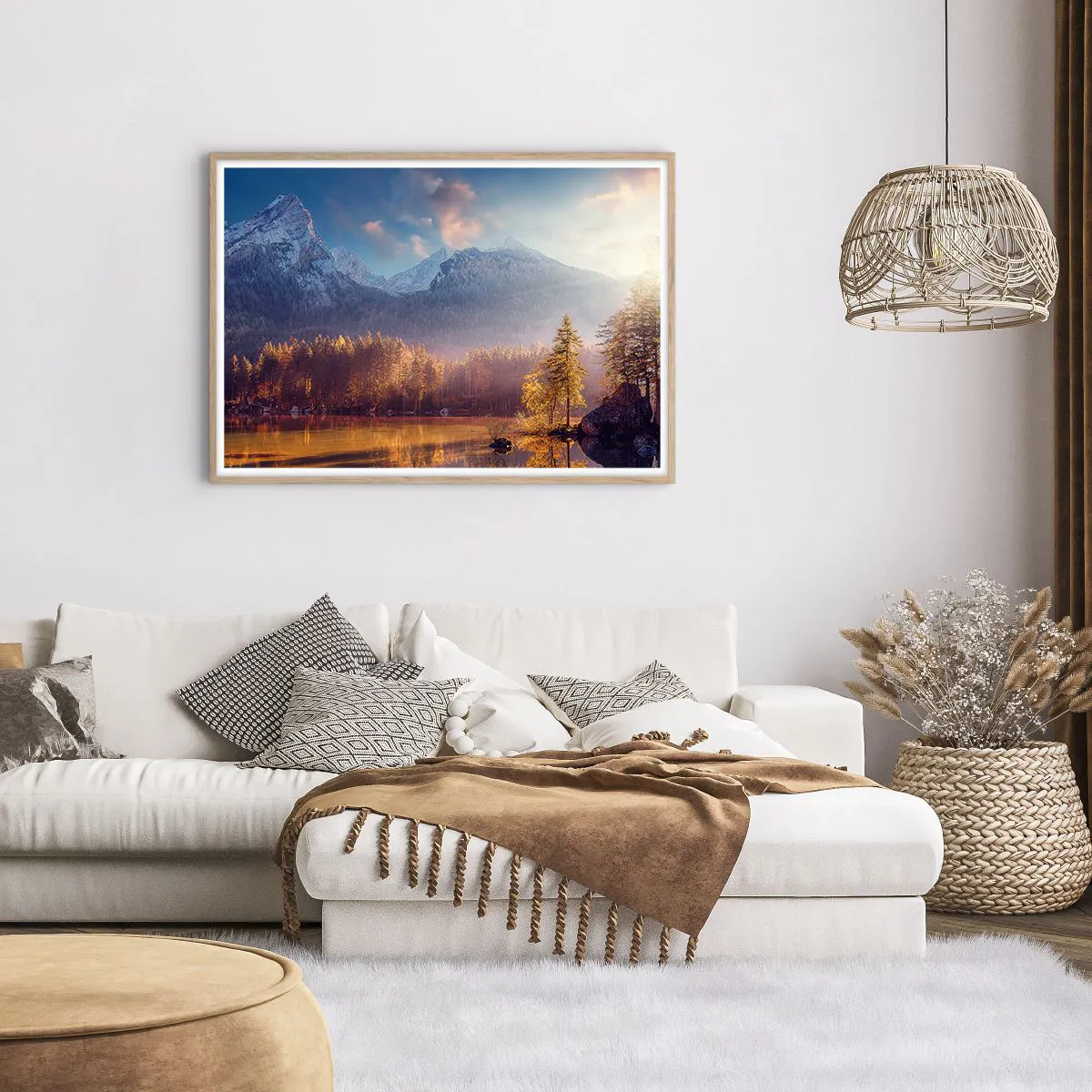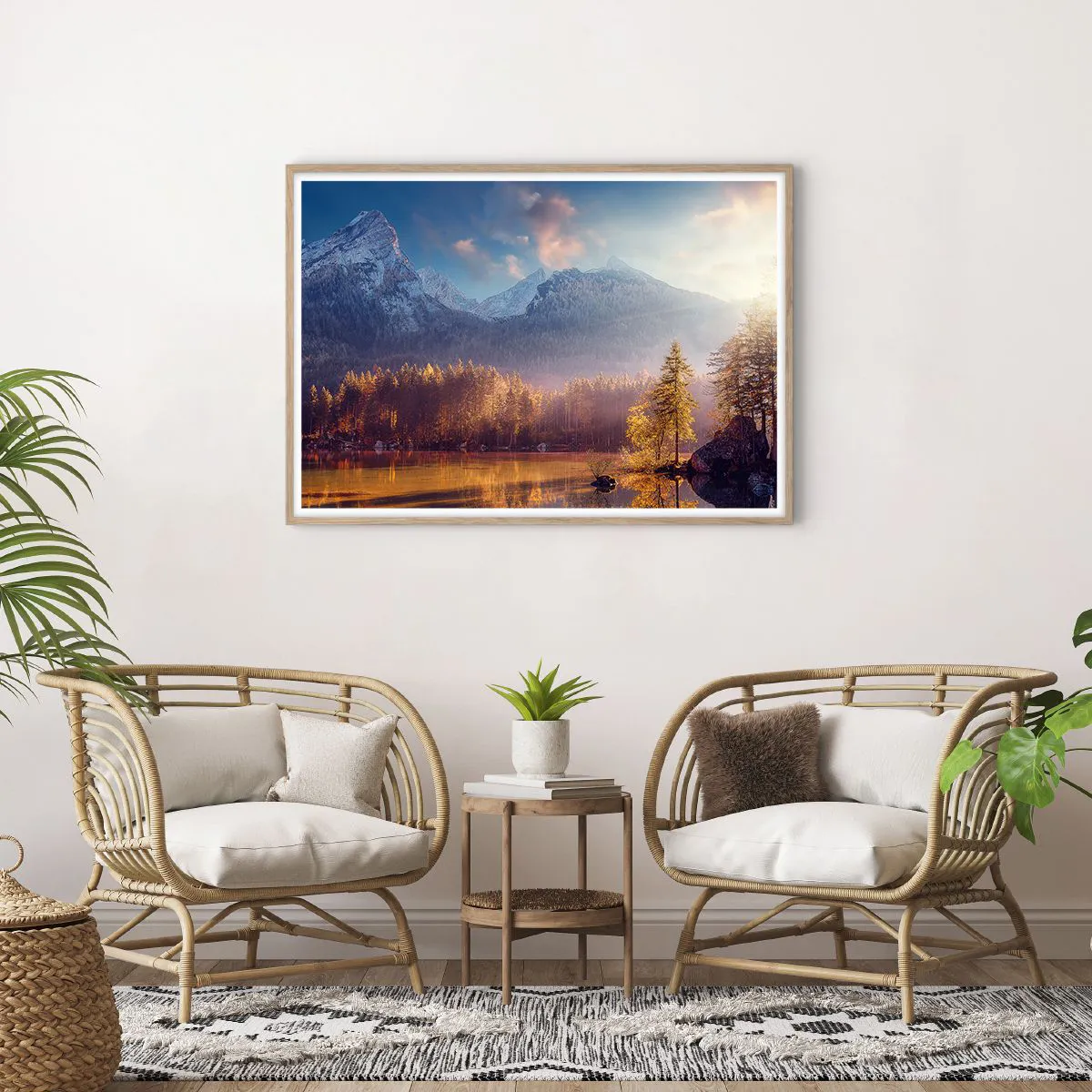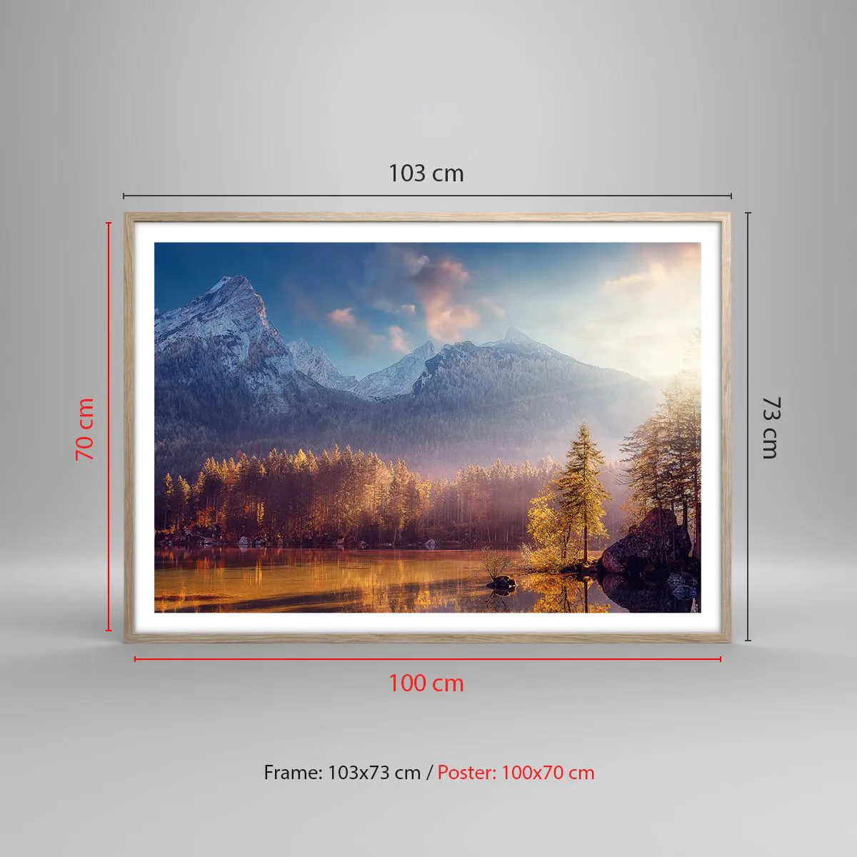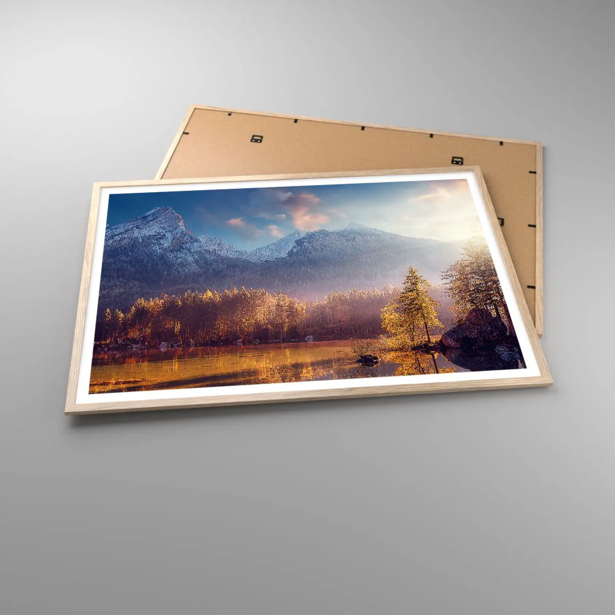 Plakat i ramme af lyst egetræ - I bjerge og dale - 100x70 cm