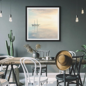 "I et hav af stilhed" er en plakat, der indfanger et øjeblik med fred og harmoni. Den forestiller et skib på et roligt hav, hvis refleksion skaber et delikat, næsten surrealistisk billede. Det er en komposition, der bringer en atmosfære af afslapning og ro til interiøret.