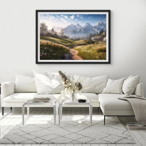 Plakat i sort ramme - En bjergsti, der fører gennem en grøn dal ved solopgang - 50x70cm - Idyllisk dal - Moderne vægdekoration til stue og soveværelse ARTTOR