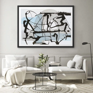 - Plakaten har en dynamisk abstraktion i nuancer af blå, sort og grå. Udtryksfuldt placerede linjer og farvestænk skaber en unik komposition, perfekt til moderne interiører.