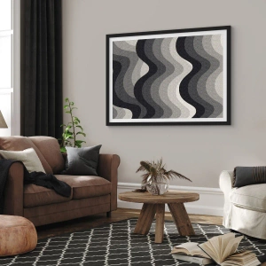 Plakat i sort ramme - Geometriske bølger i nuancer af sort og grå - 50x70cm - Bølge efter bølge - Moderne vægdekoration til stue og soveværelse ARTTOR