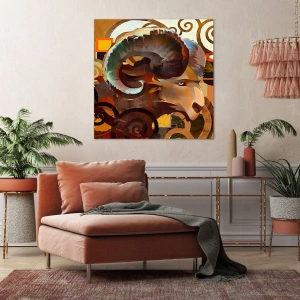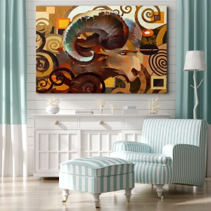 - Et lærredstryk, der forestiller en symbolsk vædder i en abstrakt komposition fuld af spiraler og varme farver. En unik dekoration, der bringer energi og karakter til ethvert interiør.