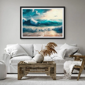 - Plakaten forestiller turkise bølger, der slår mod en gylden kyst. Den dynamiske komposition kombineret med blød belysning giver billedet en harmonisk, sommerlig fornemmelse, perfekt til rolige interiører.