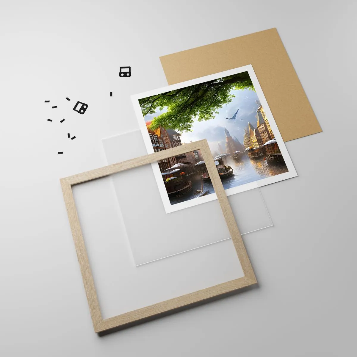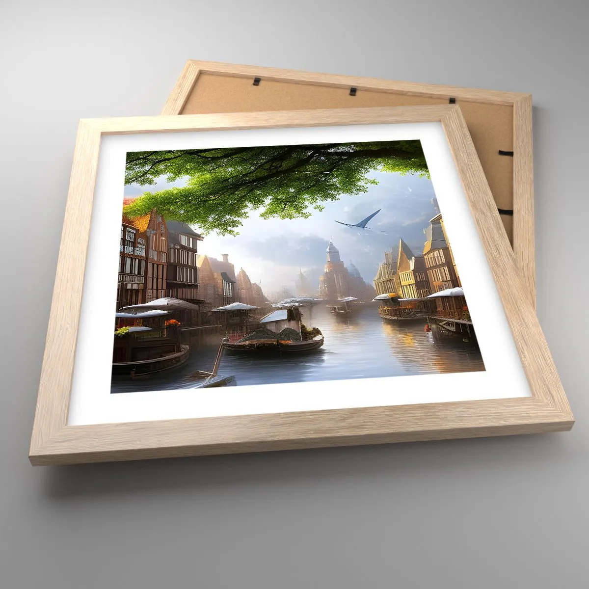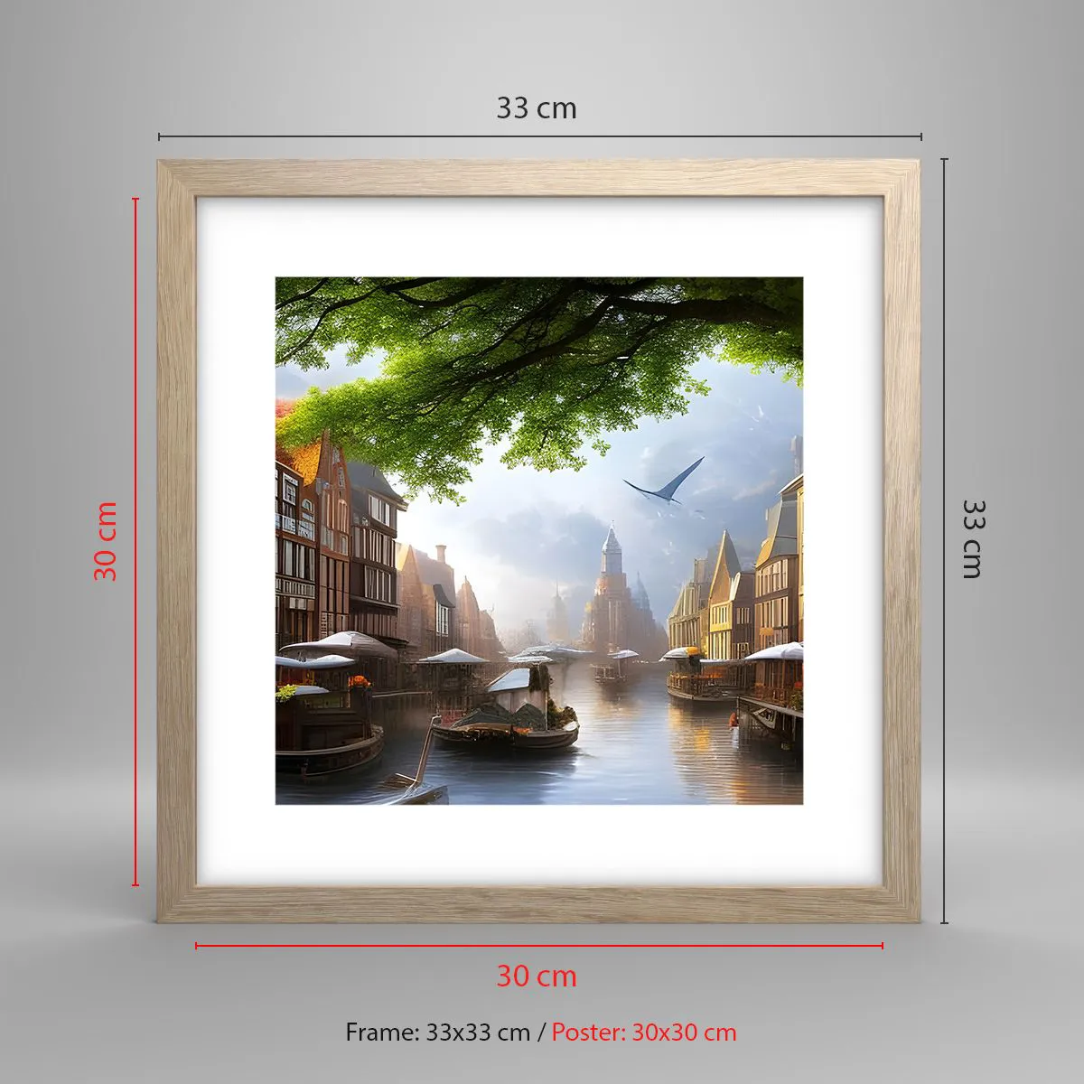 Plakat i ramme af lyst egetræ - Hollandsk bybillede - 30x30 cm