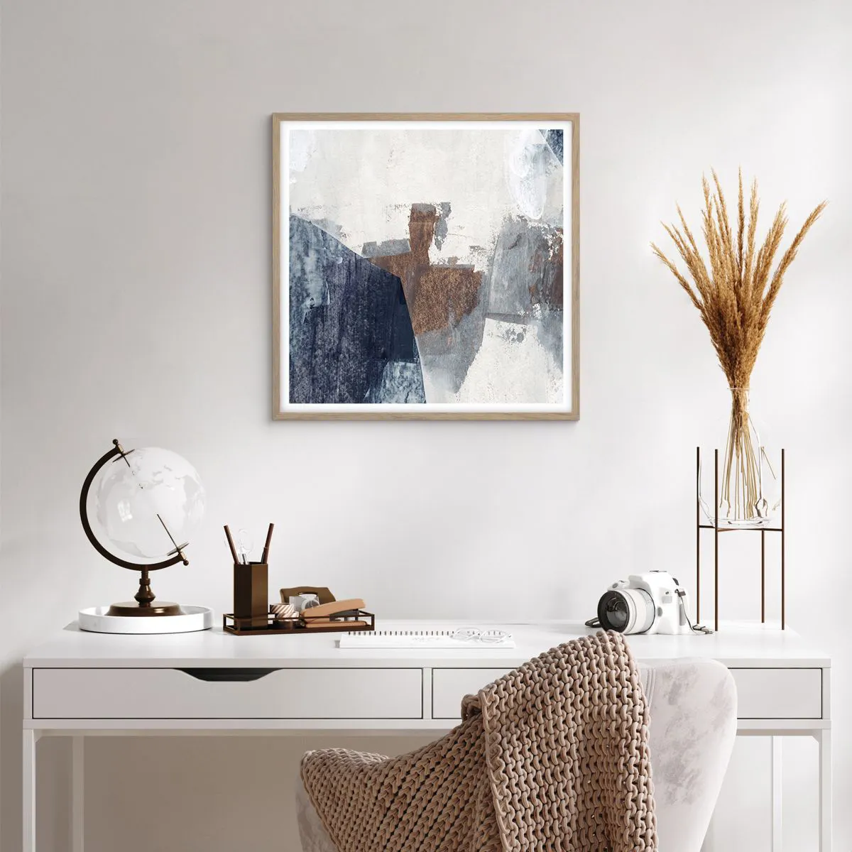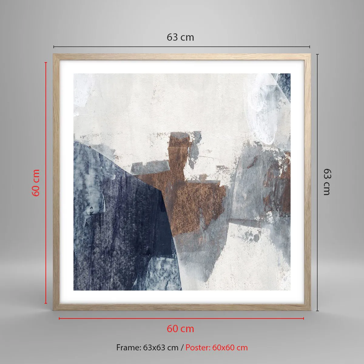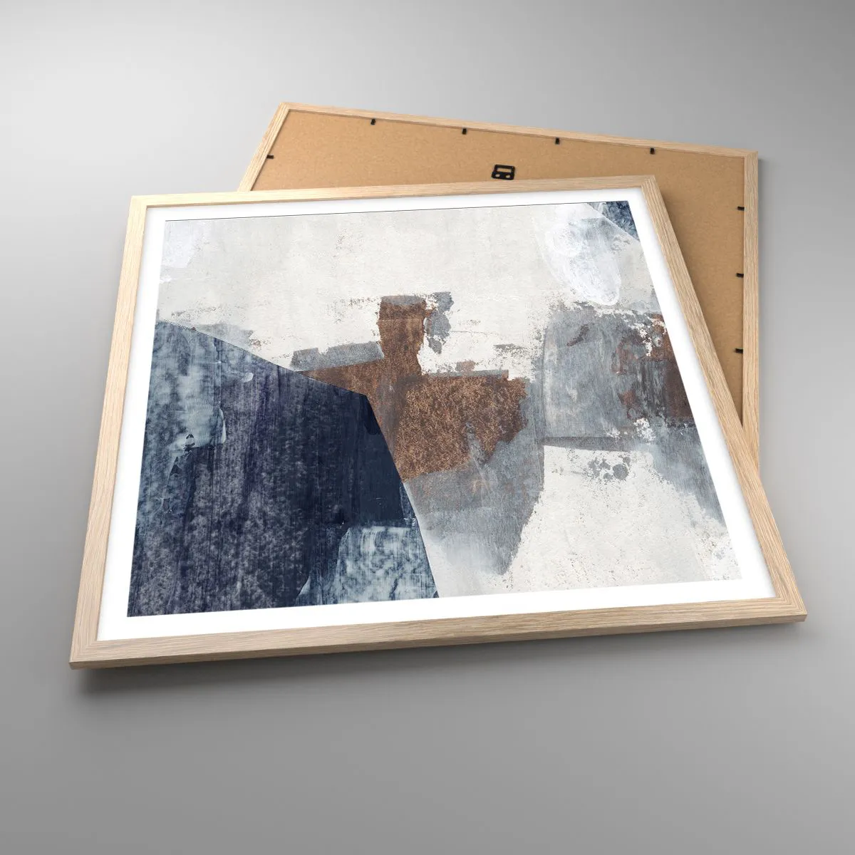 Plakat i ramme af lyst egetræ - Blåbrune former - 60x60 cm