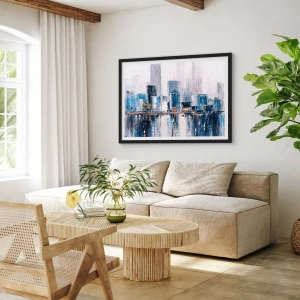 Plakat i sort ramme - Abstrakt bypanorama i nuancer af blå og hvid - 50x70cm - Indtryk fra New York - Moderne vægdekoration til stue og soveværelse ARTTOR
