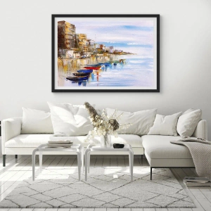 Plakat i sort ramme - Det farverige landskab i kystbyen - 50x70cm - Flerfarvet urban havn - Moderne vægdekoration til stue og soveværelse ARTTOR