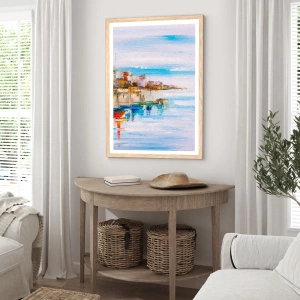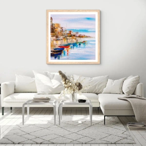 Plakat i ramme af lyst egetræ - Flerfarvet urban havn - 70x50 cm