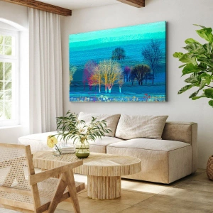 Lærredsbillede "Børstet landskab" er en unik komposition, der kombinerer naturens skønhed med en minimalistisk stil. Det skildrer farverige træer mod et blåt landskab, hvilket skaber en harmonisk og fredelig atmosfære.