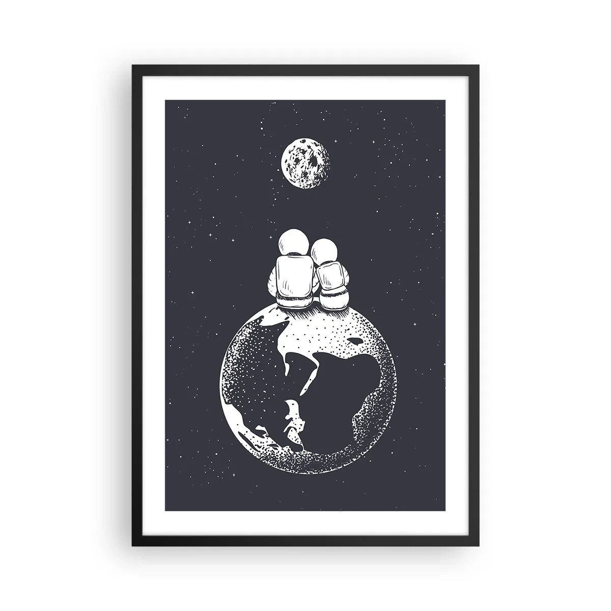 Plakat i sort ramme - Astronauter sidder på Jorden og kigger på Månen - 50x70cm - En kosmisk kærlighedshistorie - Moderne vægdekoration til stue og soveværelse ARTTOR