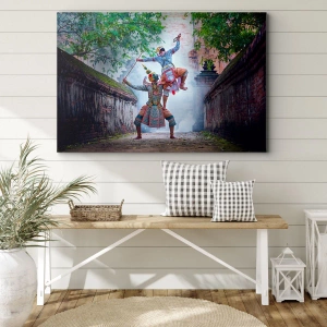 Lærredet er spændt op over rammen. Siderne og kanterne trykkes for at danne en fortsættelse af billedet. Maleriet er klar til at blive hængt op på væggen. Hvert produkt har en bøjle, der er fastgjort til rammen, og et samlesæt (skrue + dyvel).