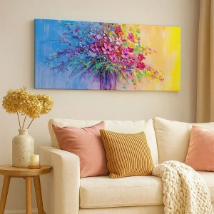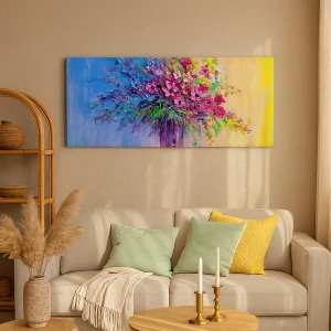 Lærredet er spændt op over rammen. Siderne og kanterne trykkes for at danne en fortsættelse af billedet. Maleriet er klar til at blive hængt op på væggen. Hvert produkt har en bøjle, der er fastgjort til rammen, og et samlesæt (skrue + dyvel).