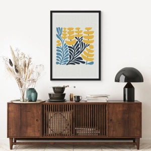 Plakatens farver er en subtil kombination af varm gul med kølig marineblå og en beige baggrund, hvilket giver den et elegant, men naturligt udseende. Rytmisk arrangerede plantemotiver bringer en følelse af balance og ro til interiøret, og deres geometriske form sikrer, at kompositionen forbliver let og stilfuld.