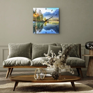 Vægur, Uret - Bjergsø ved daggry med refleksioner af træer og tinder - 30x30cm - Majestæt og sødme - Moderne vægdekoration til stue, køkken og soveværelse ARTTOR