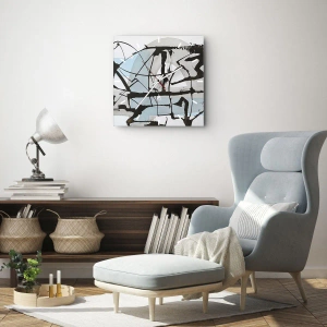 - Et ur med en dynamisk, abstrakt komposition af sorte linjer mod en blå og grå baggrund. En moderne form med en kunstnerisk karakter fuld af kontrast og udtryk.