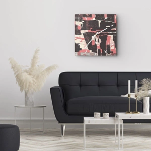 Motivet, baseret på uregelmæssige former og teksturer, tilføjer dybde til produktet. Pink accenter varmer visuelt hele møblet op, mens mørkere elementer balancerer kompositionen og understreger dets strukturelle karakter. Urets runde format tilføjer et klassisk præg, mens indretningen udtrykker frihed og modernitet.