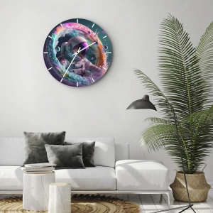 - Et vægur med en farverig grafik af en astronaut omgivet af kosmiske nuancer, der minder om en portal. En futuristisk og dynamisk dekoration med en fantastisk karakter.