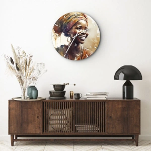 Væguret "Afrikansk dronning" udstråler glæde, styrke og skønhed. Det forestiller en smilende kvinde i en farverig turban, afbildet i en stil, der minder om akvarelmaleri. Kompositionen fokuserer på portrættets udtryk – fuld af lykke og naturligt udtryk – hvilket skaber en bevægende scene, der tiltrækker opmærksomhed og inspirerer.