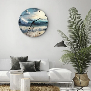 - Et ur med et malerisk billede af turbulente havbølger, der skvulper mod kysten. Kompositionen kombinerer vandets dynamik med lysets og rummets subtilitet og skaber et roligt og inspirerende landskab.