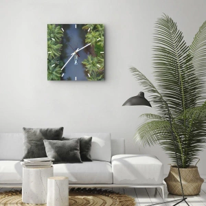Vægur, Uret - En båd på en tropisk flod blandt palmer, set fra et fugleperspektiv. - 30x30cm - På en tropisk sti - Moderne vægdekoration til stue, køkken og soveværelse ARTTOR