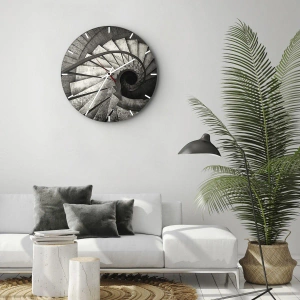 - Et vægur i glas på 30x30 cm med et sort-hvidt fotografi af en vindeltrappe, der går ned. En geometrisk og rumlig dekoration med et minimalistisk præg.