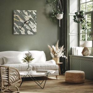 Vægur, Uret - Organiske, rytmiske former på en olivengrøn baggrund - 30x30cm - Rytmisk abstraktion - Moderne vægdekoration til stue, køkken og soveværelse ARTTOR