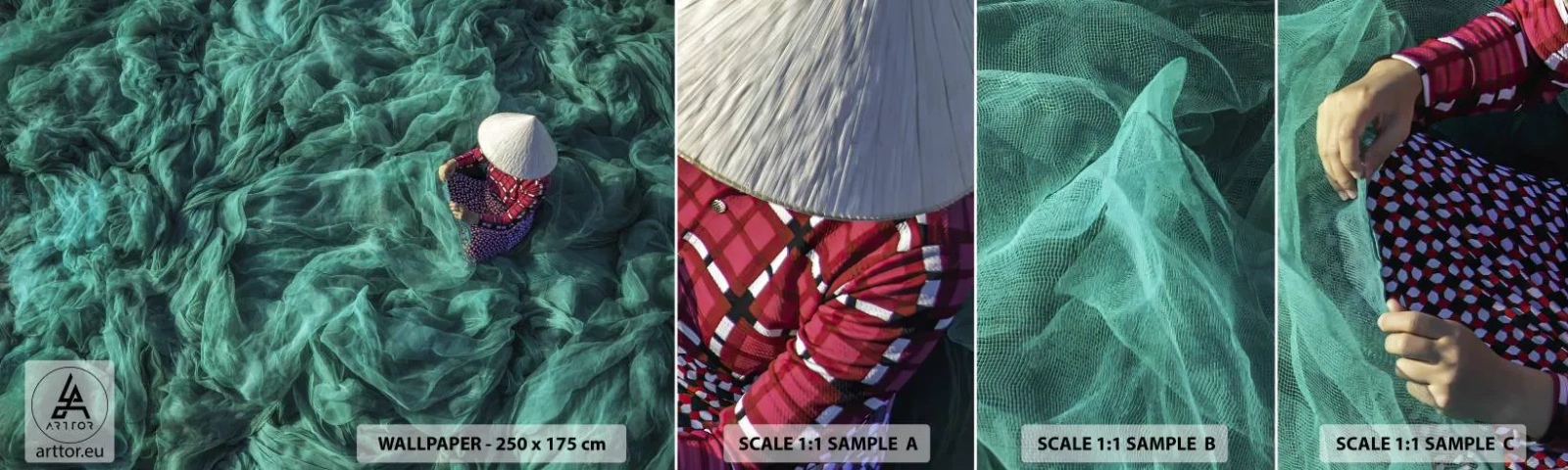 Fototapet Prøve Standard Eco - I et hav af lys - Fiskenet, Kvinde, Vietnam - 100x30 cm