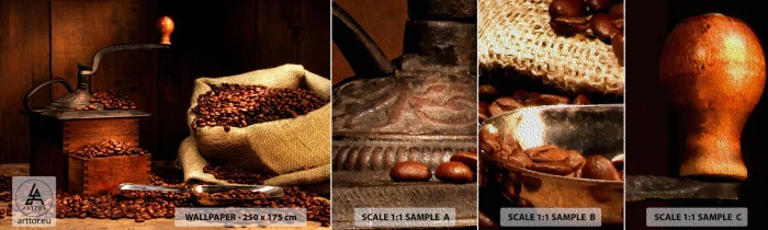 Prøve Fototapet Premium Sand - Stilleben med kaffebønner og kværn - Gastronomi, Kaffe, Kaffekværn - 100x30 cm