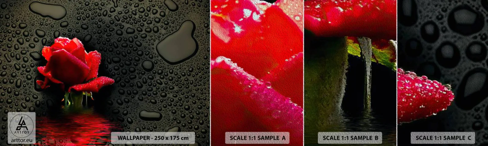Prøve Fototapet Premium Sand - Rød og sort - Blomster, Rose, Vand - 100x30 cm