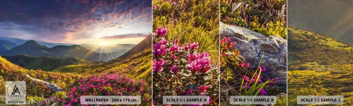 Prøve Fototapet Premium Sand - Friskheden af en morgen i bjergene - Landskab, Bjerge, Blomster - 100x30 cm