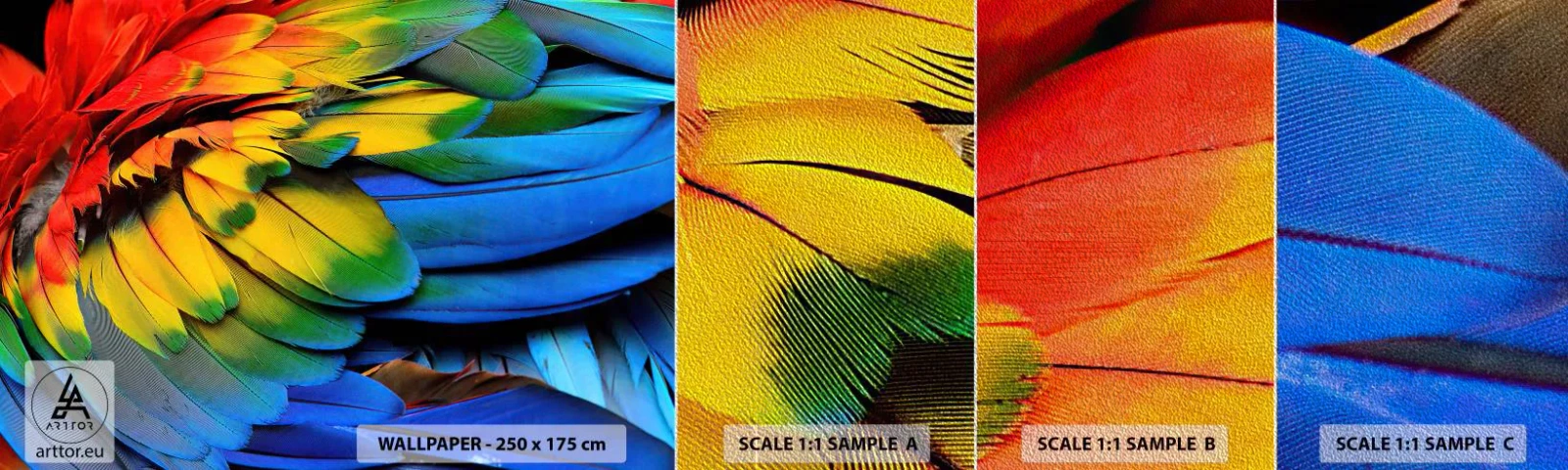 Prøve Fototapet Premium Sand - Paradisfugl - Farverige fjer, Papegøjefjer, Dyr - 100x30 cm