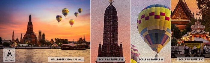 Prøve Fototapet Premium Sand - Det er her, eventyrene bliver født - Bangkok, Daggryets tempel, Thailand - 100x30 cm