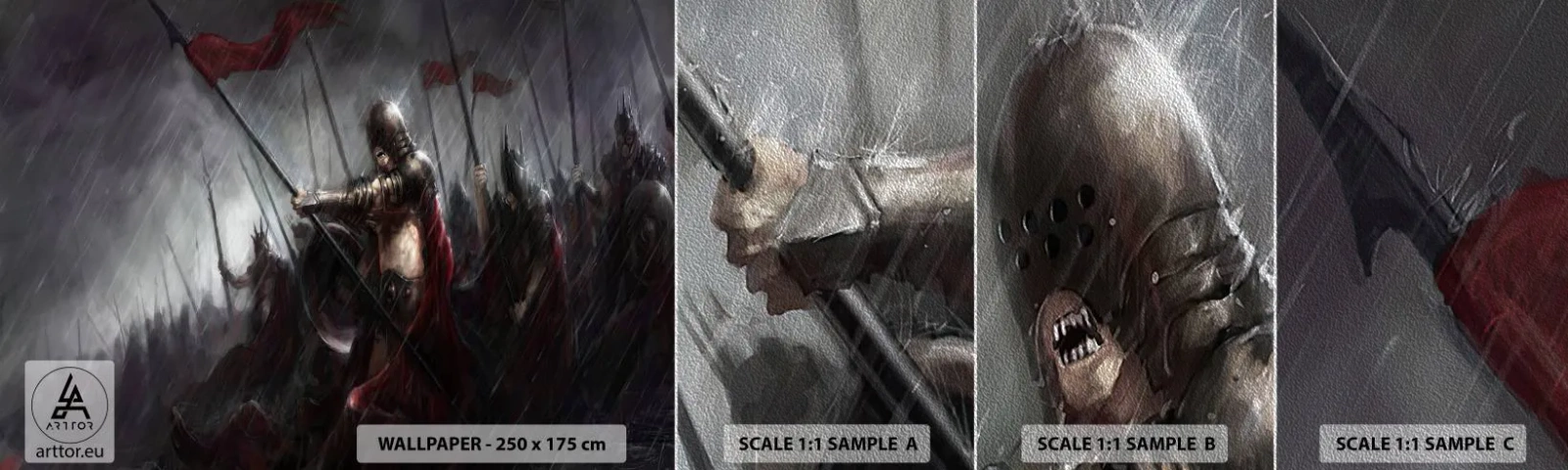 Prøve Fototapet Premium Sand - Forbipasserende, fortæl Sparta... - Ridder i rustning, hær, Abstraktion - 100x30 cm