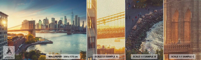 Prøve Fototapet Premium Sand - Den store bys daggry - New York, By, Brooklyn Bridge - 100x30 cm
