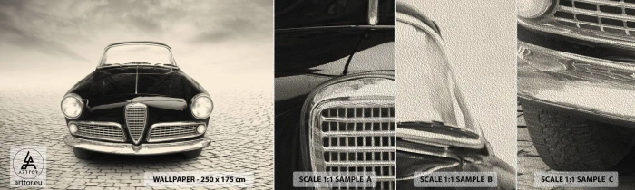 Prøve Fototapet Premium Sand - Og hvordan kan man ikke elske mig? - Bil, Årgang, Sort og hvid - 100x30 cm