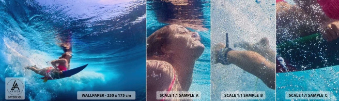 Prøve Fototapet Premium Sand - Dybden af glæde - Surfing, Kvinde, Sport - 100x30 cm