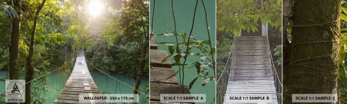 Prøve Fototapet Premium Sand - Over det azurblå vand til den azurblå skov - Landskab, Jungle, træbro - 100x30 cm