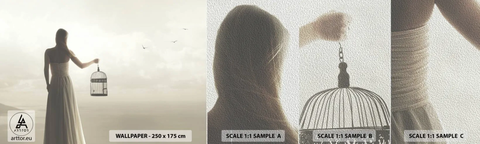 Prøve Fototapet Premium Sand - Vær fri - Kvinde, Fuglebur, Fugl - 100x30 cm