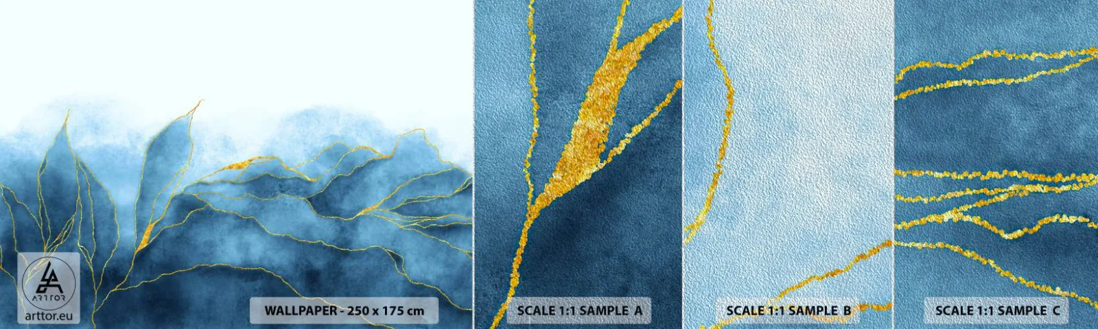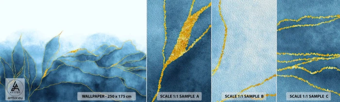 Prøve Fototapet Premium Sand - Blå i guld - Luksus, Glamour, Abstraktion - 100x30 cm