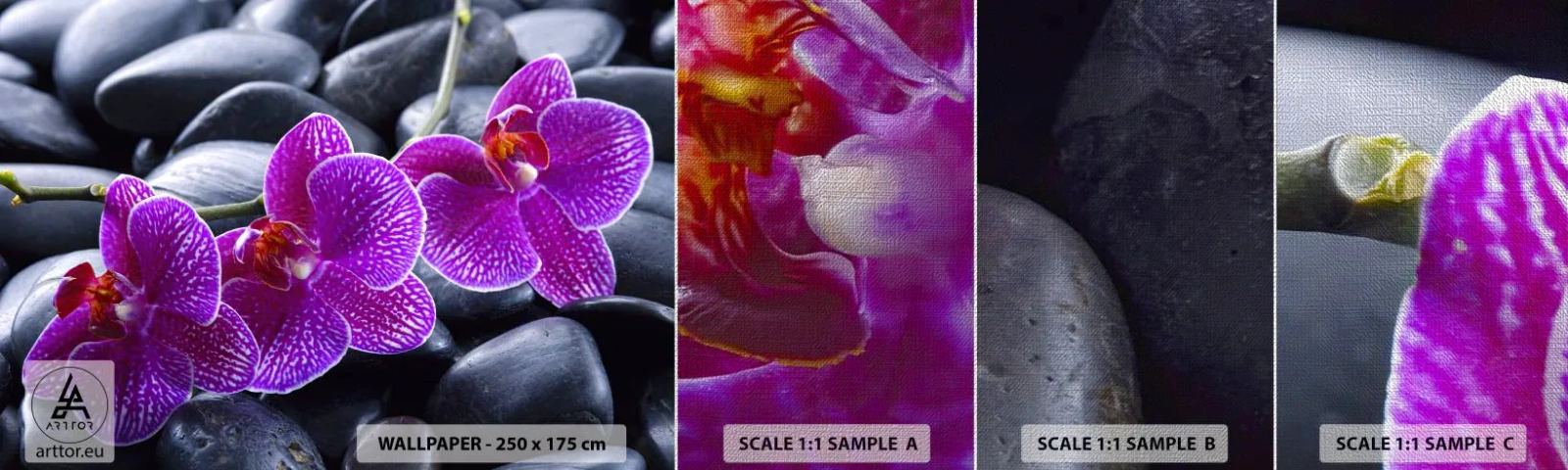 Prøve Fototapet Premium Canvas - Stenene lyste op af glæde - Blomster, Sten, Orkidé - 100x30 cm