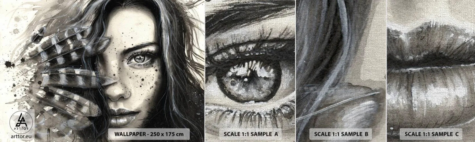 Prøve Fototapet Premium Canvas - Vild skønhed - Kvinde, Fuglefjer, Grafik - 100x30 cm