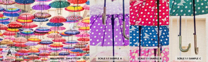 Prøve Fototapet Premium Canvas - Engen i byen - By, Farverige paraplyer, Stykke - 100x30 cm