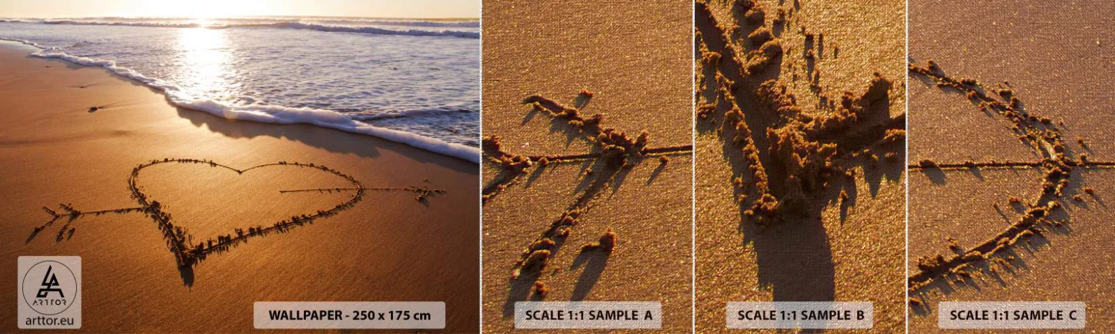 Høj grammatik 290g/m2 sammen med en taktil struktur Sand på overfladen af tapetet gør produktet til en eksklusiv og designorienteret løsning for alle, der leder efter unikke indretningsdekorationer. Fordelen ved materialets ekstraordinære tykkelse er også fremragende dækning, hvilket samtidig letter installationen betydeligt. Strukturen fototapet PREMIUM SAND giver indtryk af et print på en fin struktur, der minder om sand.