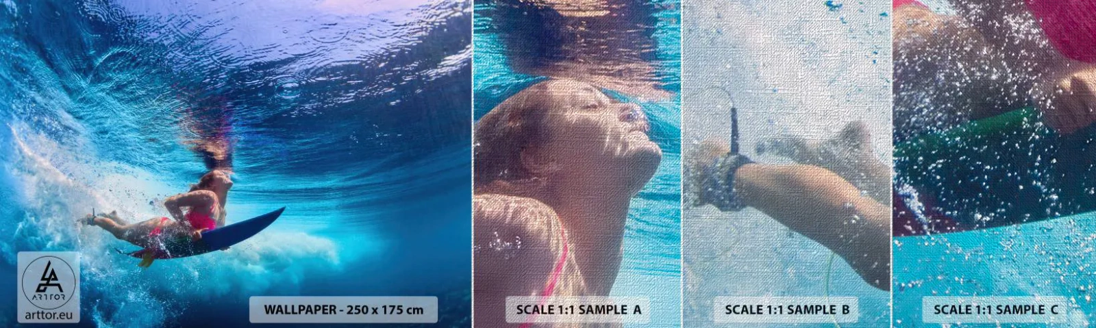 Prøve Fototapet Premium Canvas - Dybden af glæde - Surfing, Kvinde, Sport - 100x30 cm