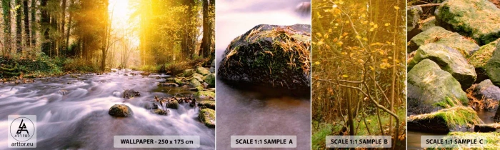 Prøve Fototapet Selvklæbende Deluxe Sticker - Malachit i sølv- og guldfatning - Landskab, Bjergstrøm, Skov - 100x30 cm