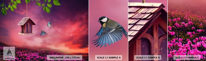 Prøve Fototapet Selvklæbende Deluxe Sticker - Invitation til middag - Landskab, Blomster, Fuglehus - 100x30 cm