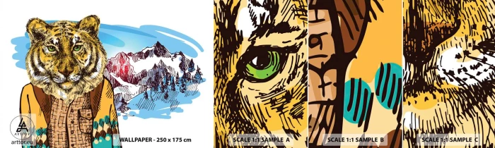 Prøve Fototapet Selvklæbende Deluxe Sticker - Ikke så vild som han er tegnet - Abstraktion, Tiger, Bjerge - 100x30 cm
