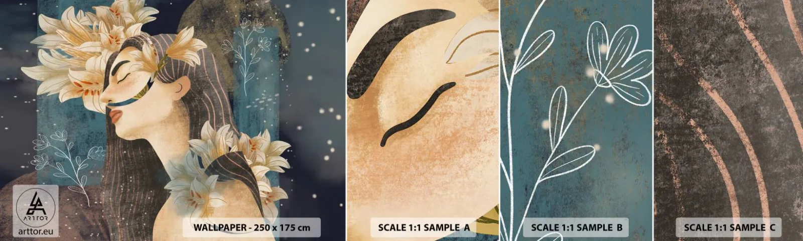 Prøve Fototapet Selvklæbende Deluxe Sticker - Eventyret om prinsessen med liljerne - Abstraktion, Kvinde, Blomster - 100x30 cm
