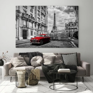 Glasbilledet "Rød bil i Paris" er en unik komposition, der kombinerer klassiske og moderne stilarter. Det forestiller en malerisk gade i Paris med en karakteristisk udsigt over Eiffeltårnet, suppleret af en retro rød bil. Kombinationen af en sort-hvid baggrund med bilens udtryksfulde røde farve giver billedet en unik karakter og tiltrækker opmærksomhed.