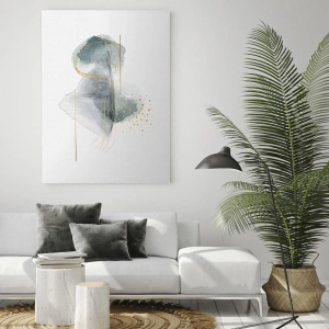 Det præsenterede maleri "Om forholdet mellem grå og guld" er domineret af en subtil, men meget udtryksfuld abstraktion. Den kunstneriske komposition kombinerer delikate akvarelfarver i nuancer af grå og blå med dynamiske, gyldne linjer og prikker. Helheden skaber en unik effekt af rum og harmoni, samtidig med at den opretholder en moderne, minimalistisk karakter. De centrale elementer tiltrækker øjet, og deres placering mod en lys baggrund giver formen et indtryk af at svæve. Maleriet passer perfekt ind i aktuelle indretningstrends og er samtidig en universel dekorativ tilføjelse.